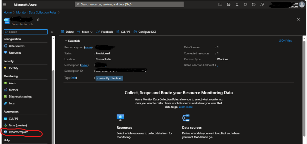 5. Once you are inside DCR section, select “Export template” in the automation segment.
