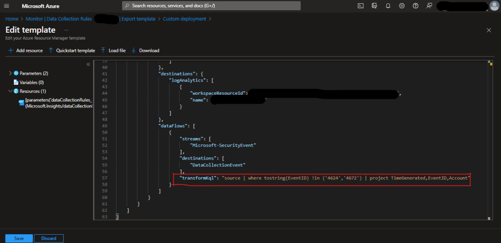 8. In the json template, add the desired KQL transformation at the bottom under the “transformkql” section as shown below.